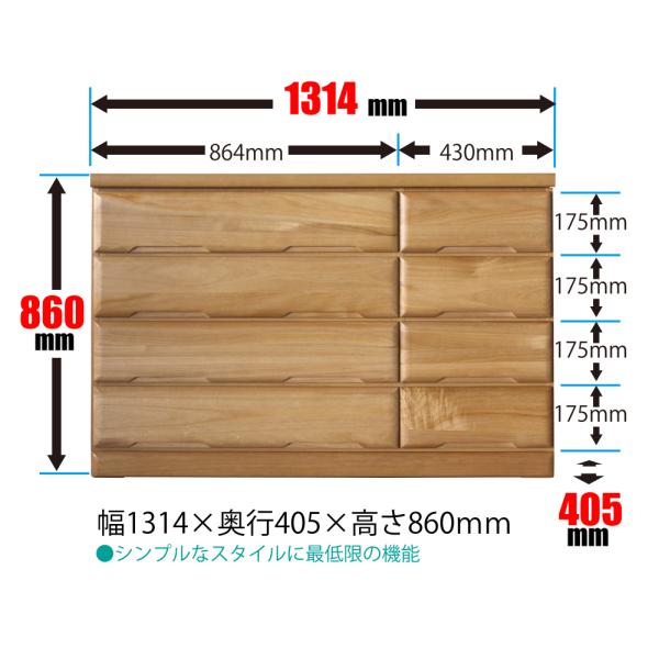 本体:幅1314mmx奥行405mmx高さ860mm 【内寸】 ・大引出し(4つ共通):幅789mm×奥行338mm×高さ112mm ・小引出し(4つ共通):幅377mm×奥行338mm×高さ142mm 素材/材質 ・表面材:桐無垢集成材 ・側面材/天板/天板材:プリント紙化粧繊維版 ・塗装:ウレタン塗装 色 ・ナチュラル、ブラウン ご注意事項 ※送料無料九州~関東送料無料 ■追加送料(1本あたり/税抜):別途東北:¥3,000 北海道:¥5,000。