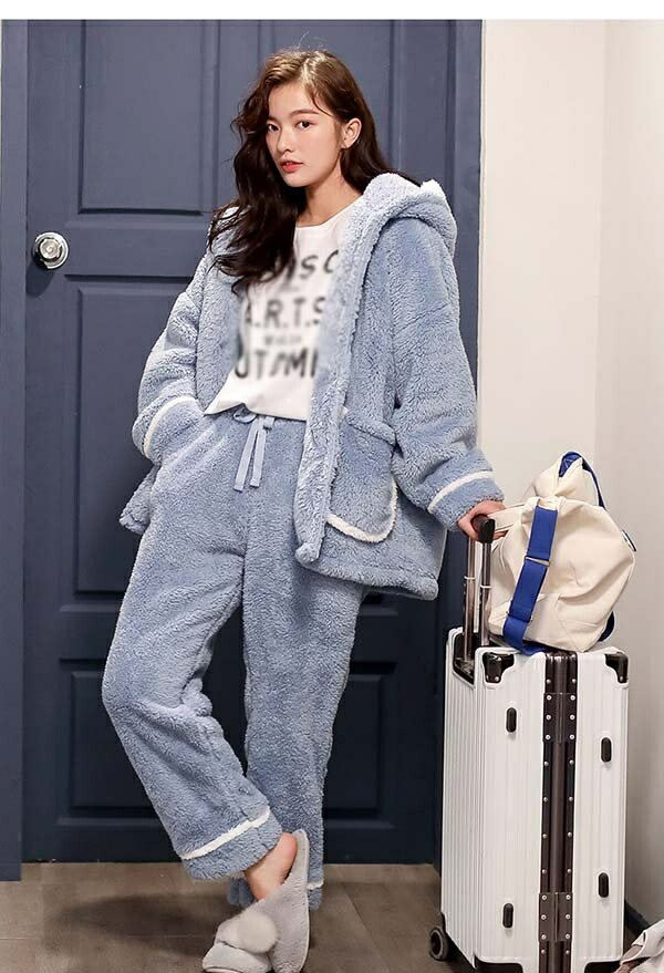 パジャマ レディース 長袖 冬 ルームウェア 厚手 かわいい 上下セット 前開き 大きいサイズ 部屋着 寝間着 長ズボン あったか 可愛い 女性用 婦人 もこもこ シンプル 裏起毛 プレゼント 無地 ブルー【送料無料】
