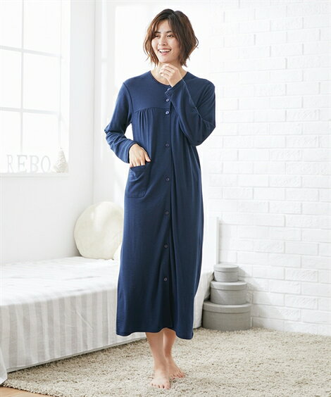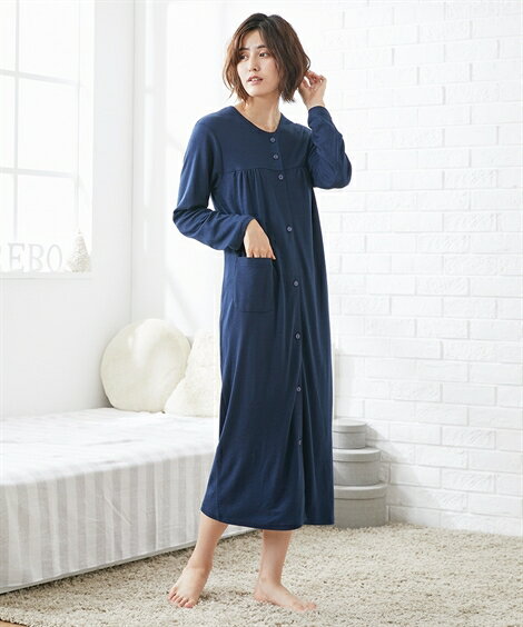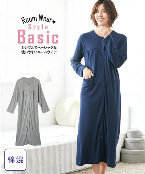 パジャマ トップス 大きいサイズ レディース 綿混 やわらか スムース 前開き ロング ワンピース グレー/ネイビー LL/3L ニッセン nissen