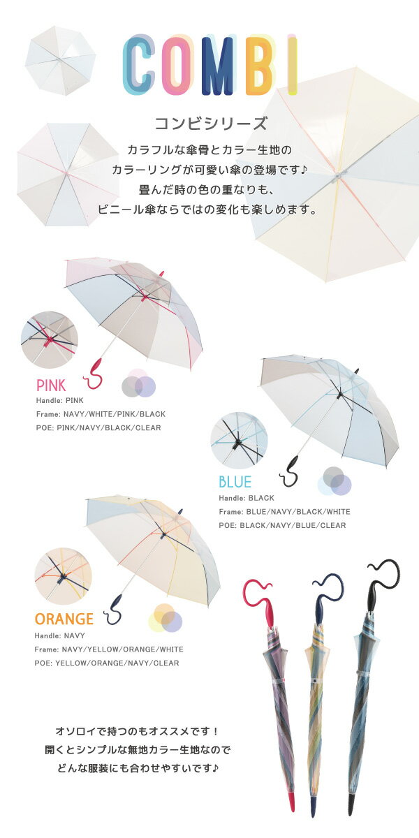 畳むと濃く色づき、開くと淡い色合いがビニール傘ならではの可愛さです(^▽^) 家族やお友達と色違いで持つのもオススメです! 傘骨の配色もカラフルなので内側から見ても満足な可愛さ♪