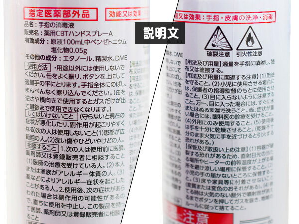 有効成分 原液100ml中ベンゼトニウム塩化物0.05g その他の成分 エタノール、精製水、 DME(Di-Methyl Etherジメチルエーテル) 容量 100ml 使用方法 用途以外には使用しないでください。